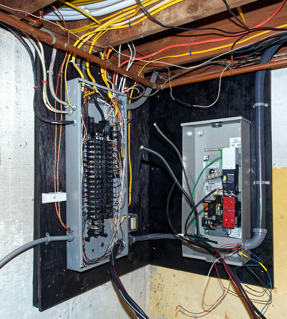 In the basement, the service panel for the Generac hangs to the right of the main service panel for the whole house.