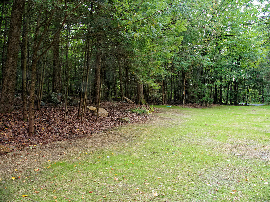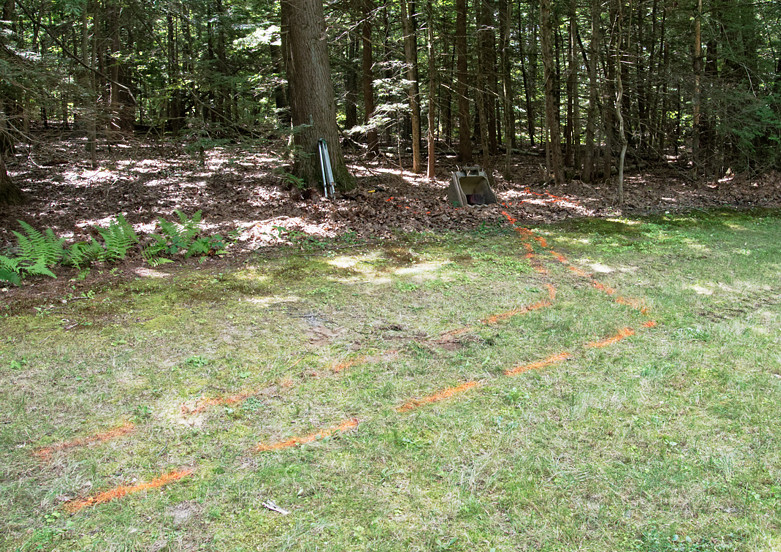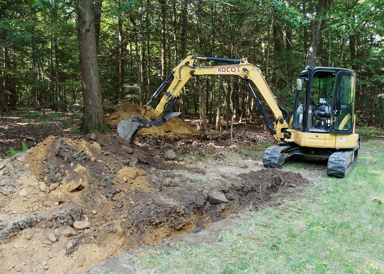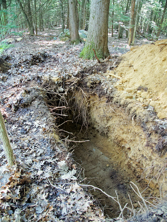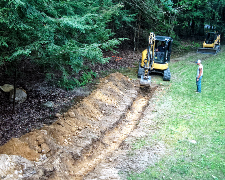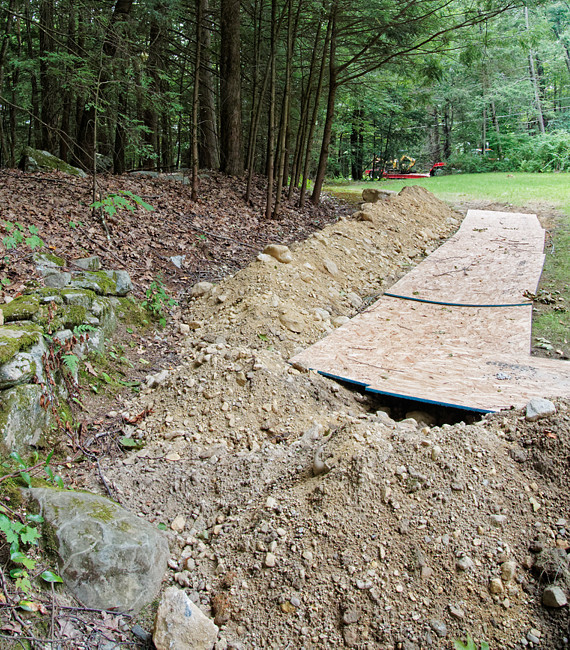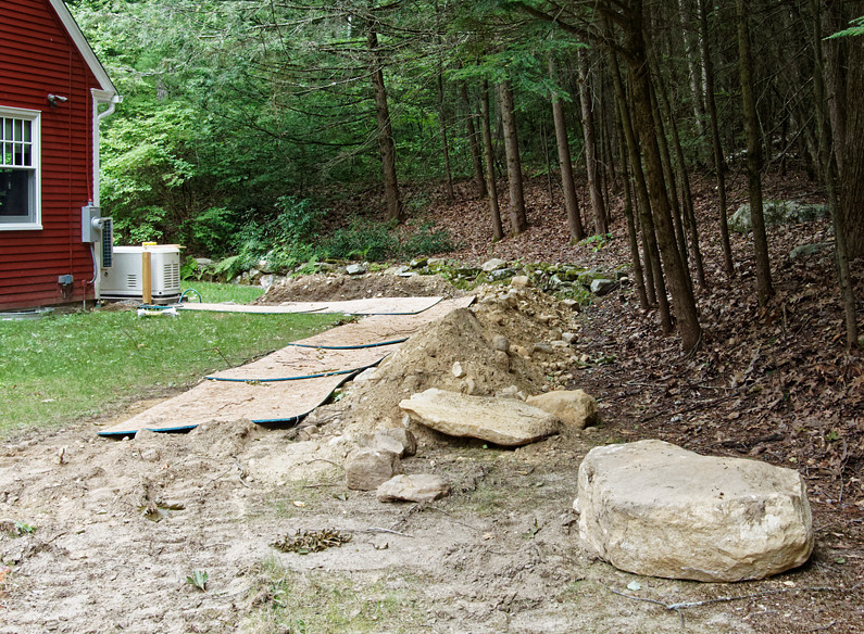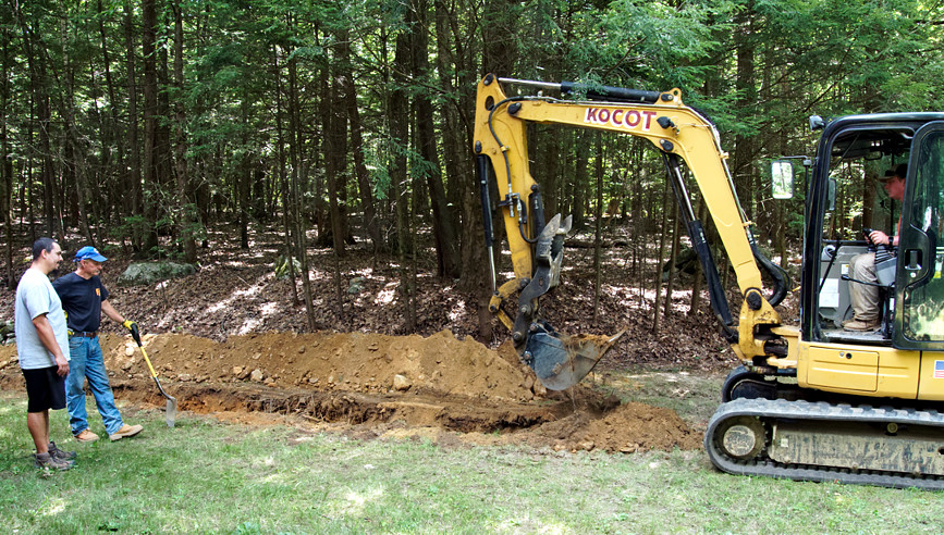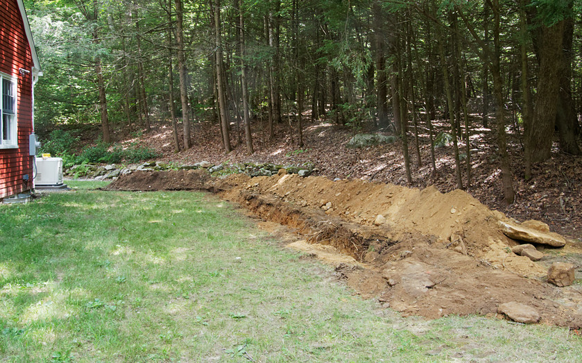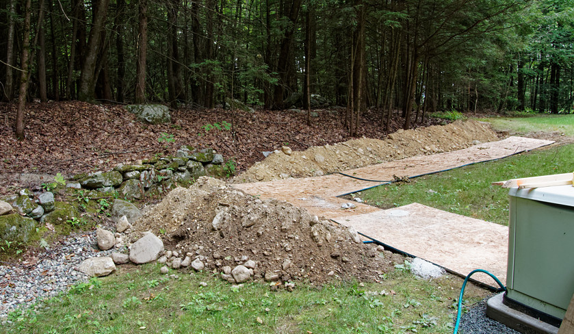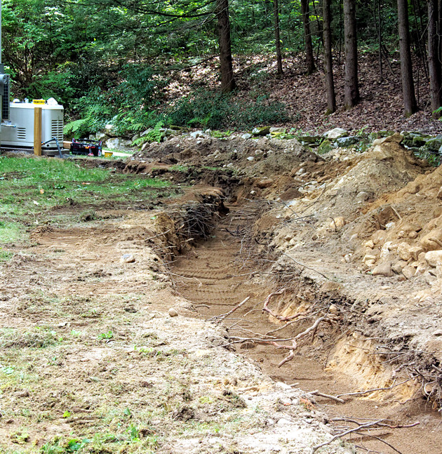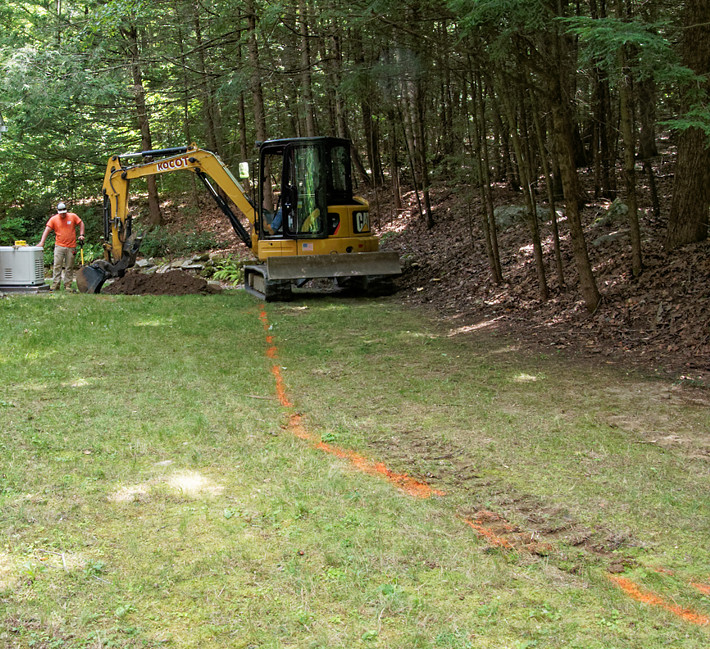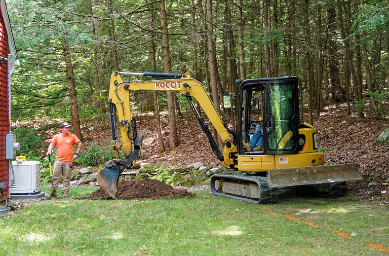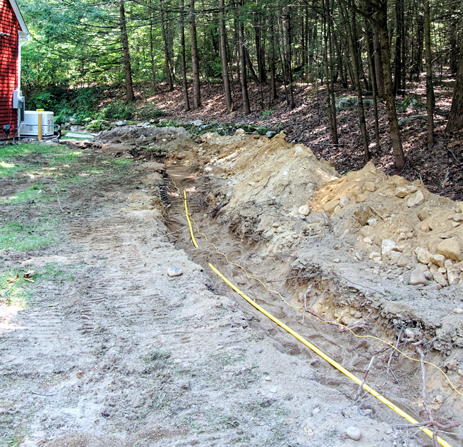 Here the excavator makes a small mistake. The original orange lines drawn on the grass about a week ago showed the pipeline going due south from the Generac to the stone wall and then turning west in a right-angle turn. Bob Goulet saw this and thought it much better to have the pipe lead away from the Generac in a soft curve. Above, you can see this second route marked in faint orange along the bottom of the picture; but the shovel is following the more distinct line that heads straight towards the wall before making a right angle turn. (The tractor treads are lined up perfectly along this original route.) ... Later on, it will take only a few minutes to correct this error, and dig the "curved hypotenuse." |