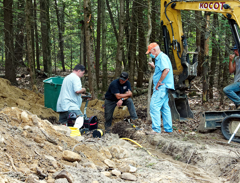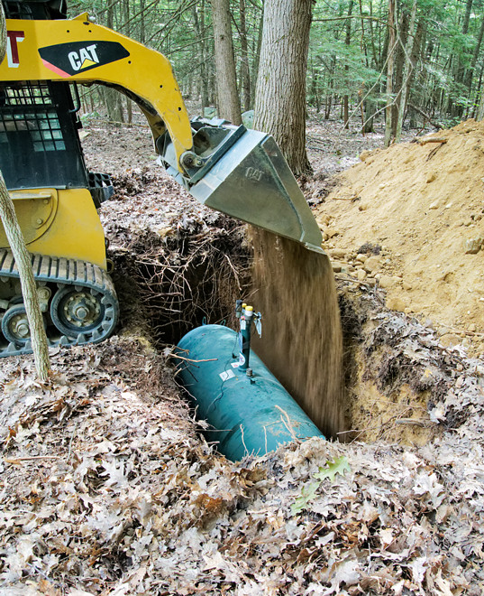 The pipeline (the yellow tube in the trench) is being attached to the tank by the installer, while the Gas Inspector (with face mask) and Kocot's excavators look on.
