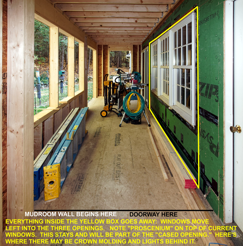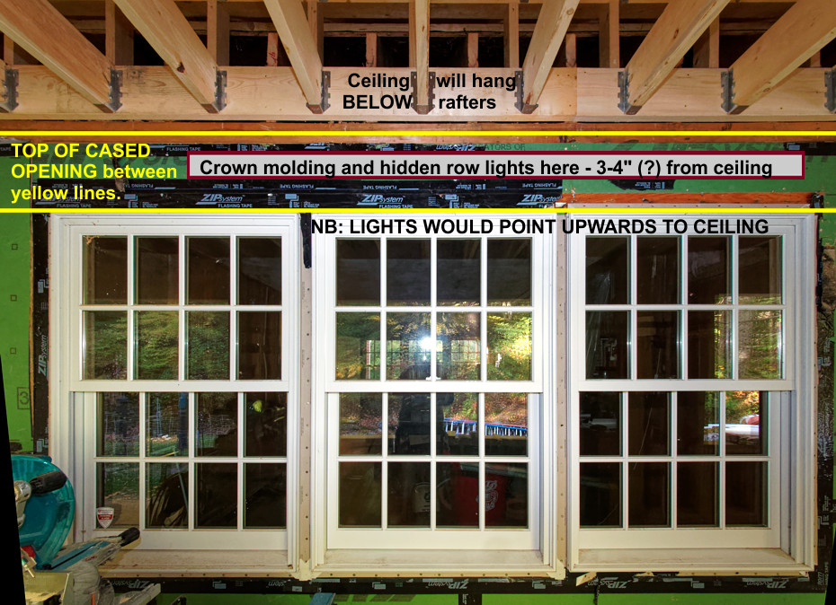 Next we look at the old windows and try to envision the idea of a strip of lights hidden behind a crown molding that would be part of the frame of the cased opening. I don't see these lights running around the entire corridor - just the length of the "proscenium."