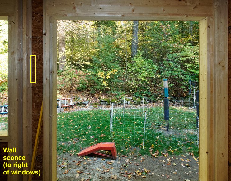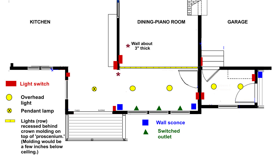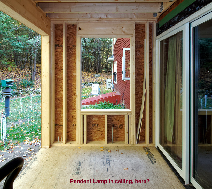 Below is a view of the area in front of the opening into the kitchen. One idea is to hang a pendent light from the ceiling here. The other ceiling lights would be simple, small fixtures. I haven't decided whether they should be recessed into the ceiling.