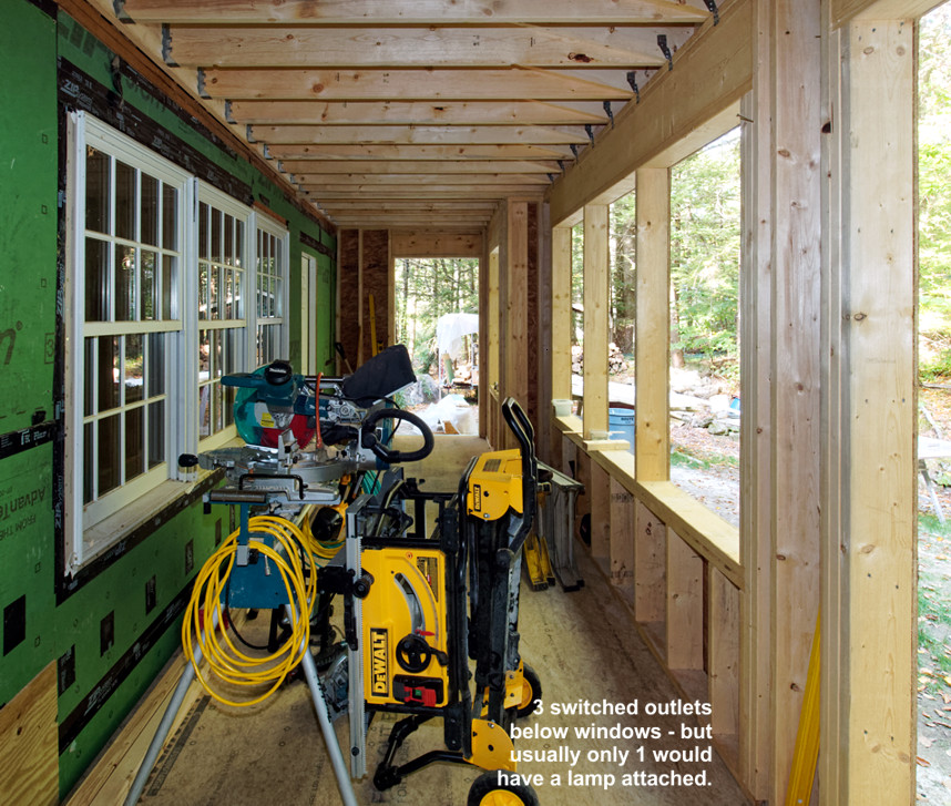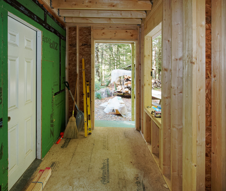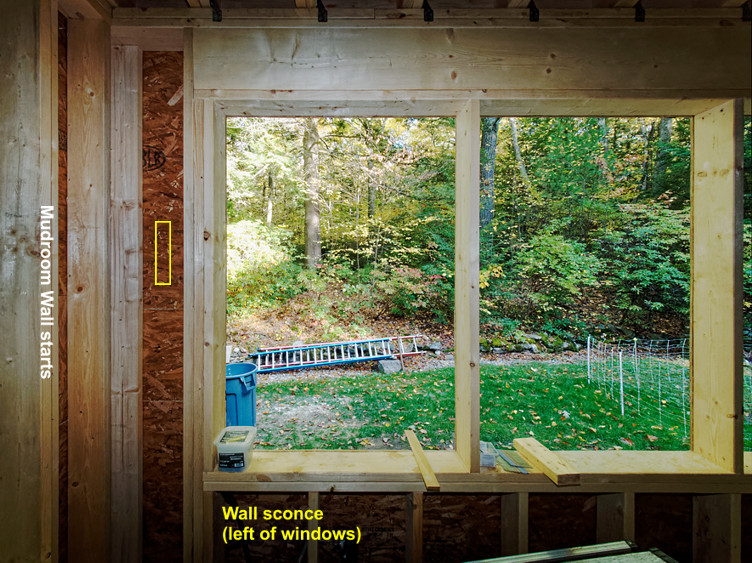 Now we look at the other end of the Addition - the mudroom. (Entrance to the garage on the left; this door is temporary.) It's been recommended that I put two ceiling lights in here - one in front of the garage door, the other half way to the backdoor.